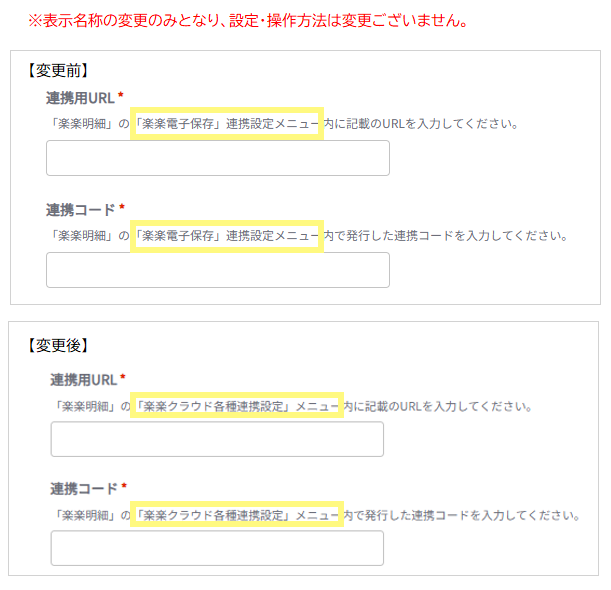 | 概要 | 楽楽明細連携設定に関する一部表示名称変更のお知らせ |